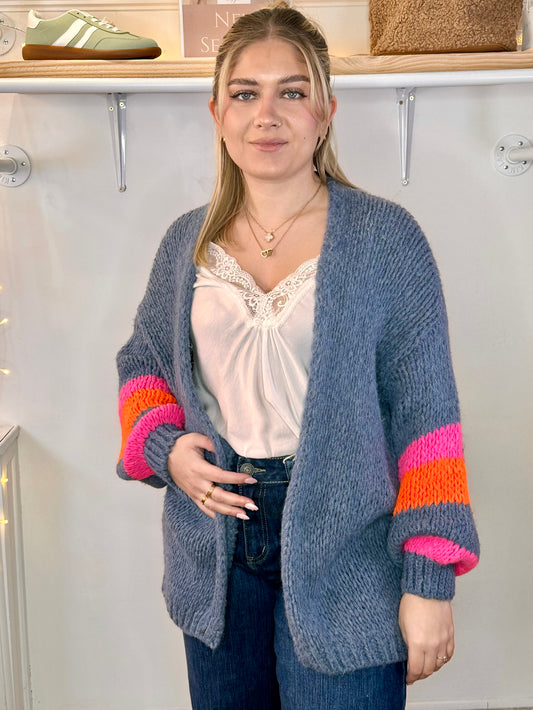 Diva Denim blue chunky cardigan with neon stripe detail to sleeve