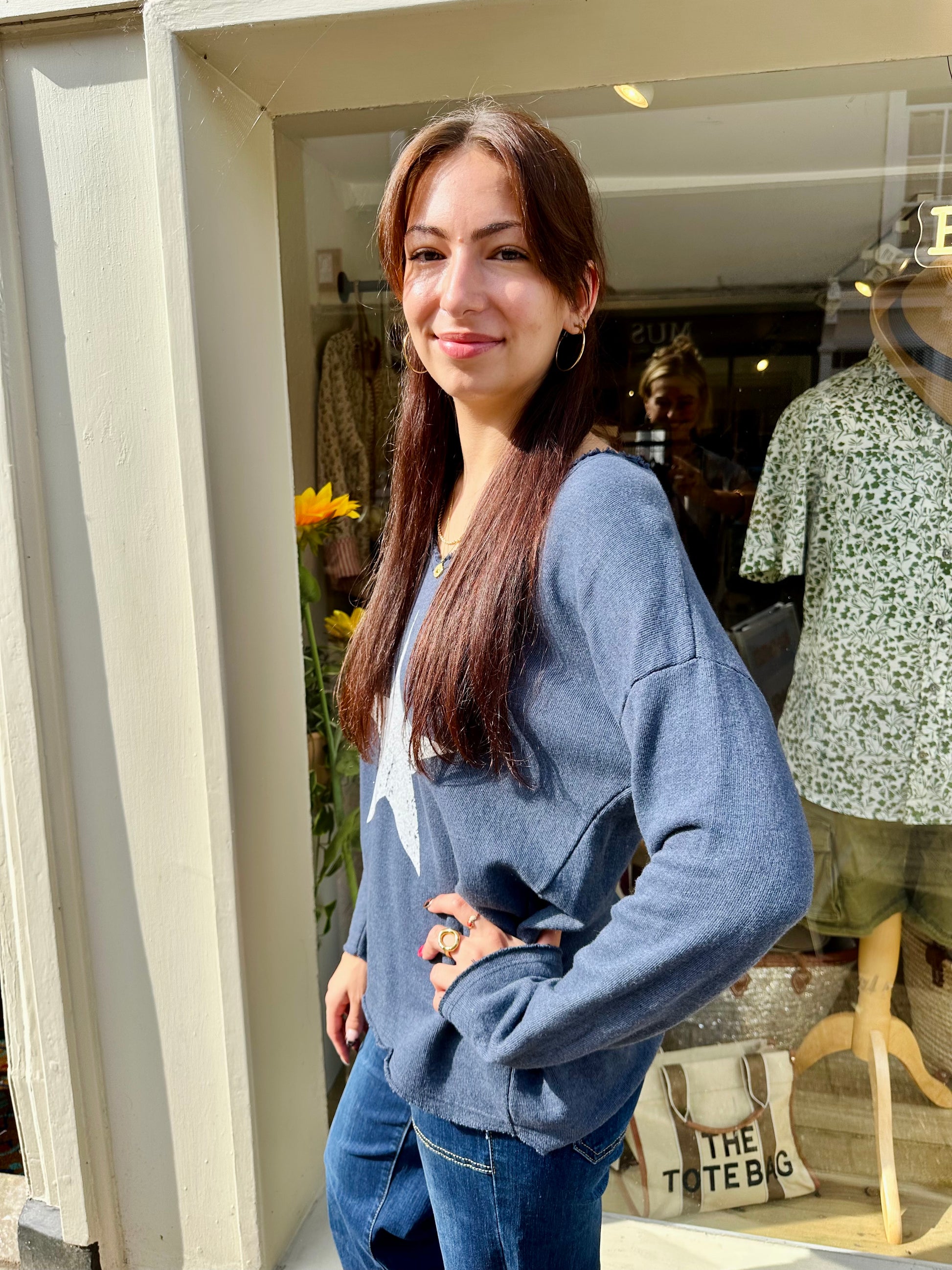 The perfect weekend staple, easy to throw on with your favourite jeans to instantly feel put together! It's lightweight, V-Neck with frayed edge detailing and White star print.