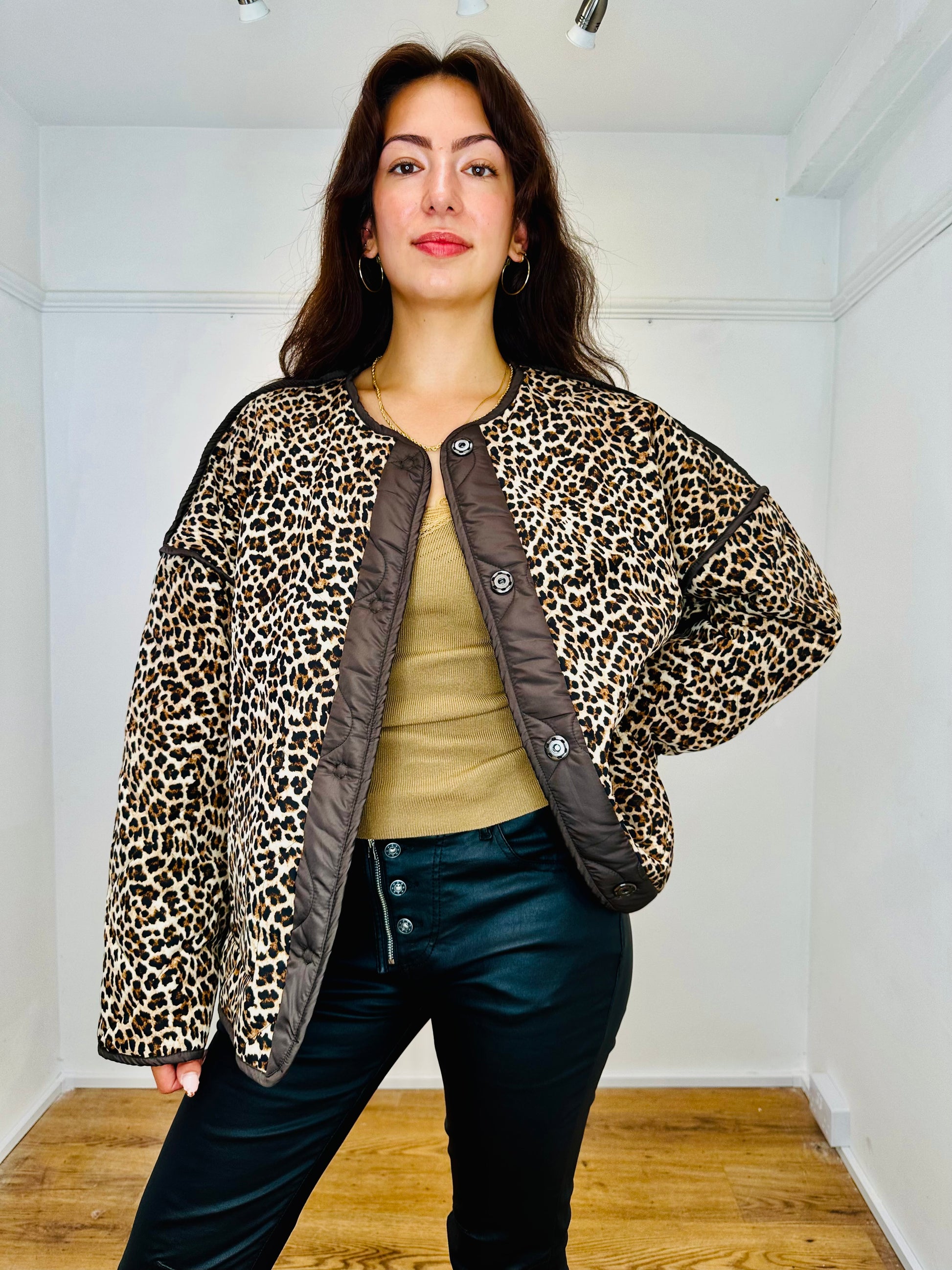 This 2 in 1 reversible jacket will be a super useful yet practical addition to your autumn wardrobe, one side of the quilted jacket is a stunning chocolate brown, the other leopard printed with chocolate brown trim. Lightweight yet warm!
