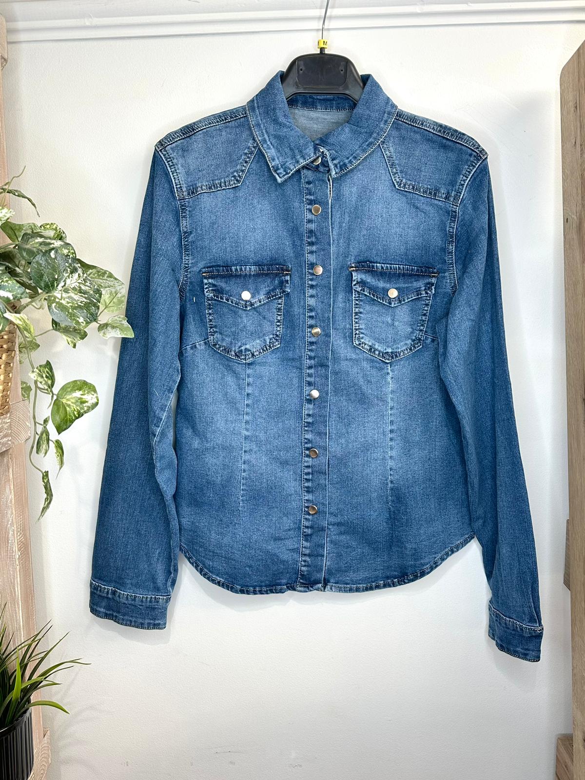 Everyday classic staple denim shirt. Stud button front. Two pocket detail to front. Mid wash denim