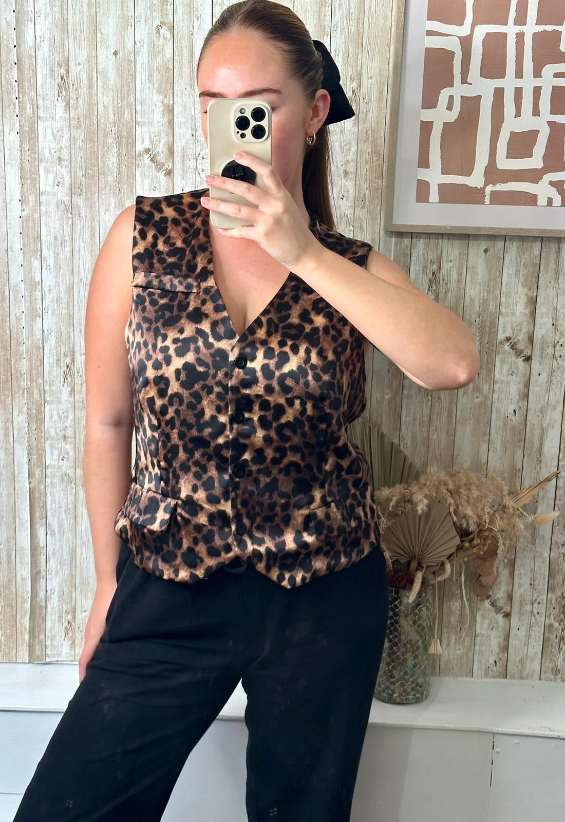 Gorgeous leopard print waistcoat, tailored fit, silky feel with pocket detail. Perfect to pair with jeans or shorts and chunky boots.