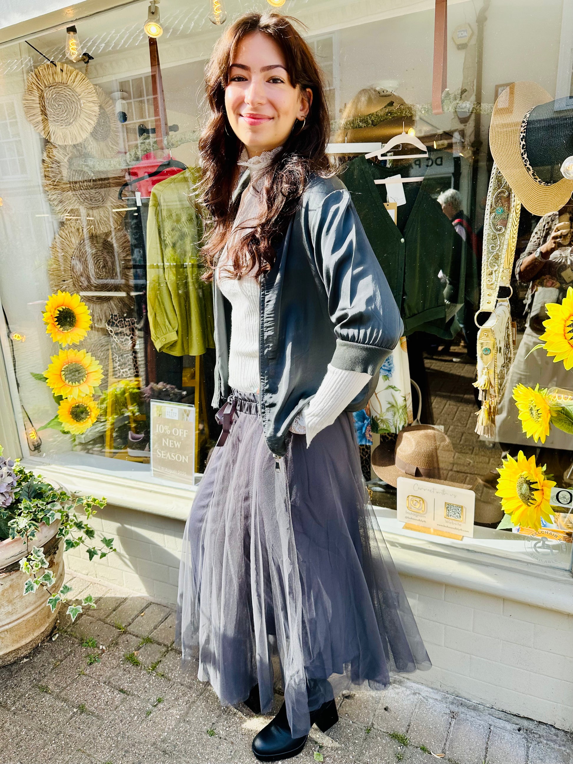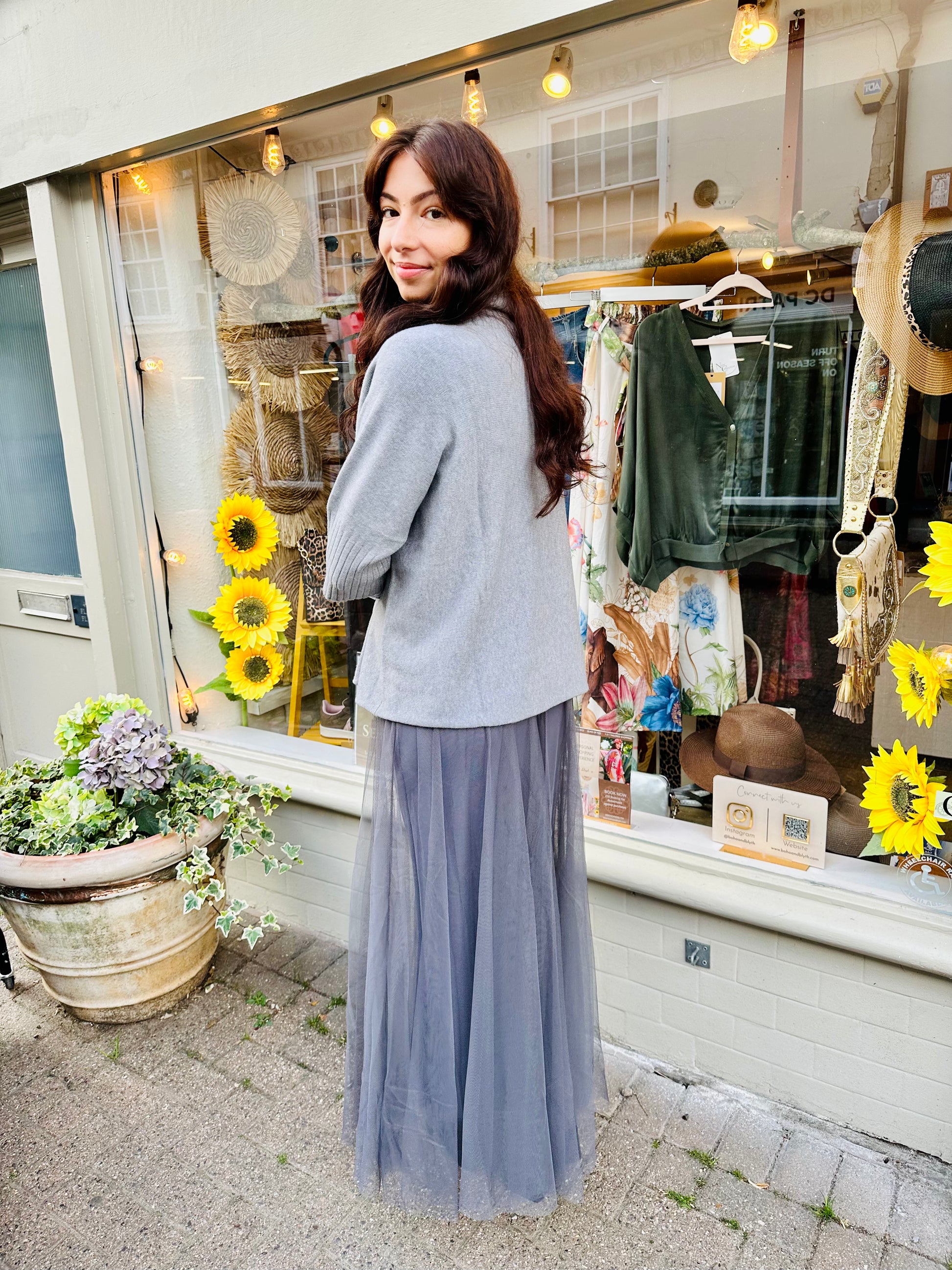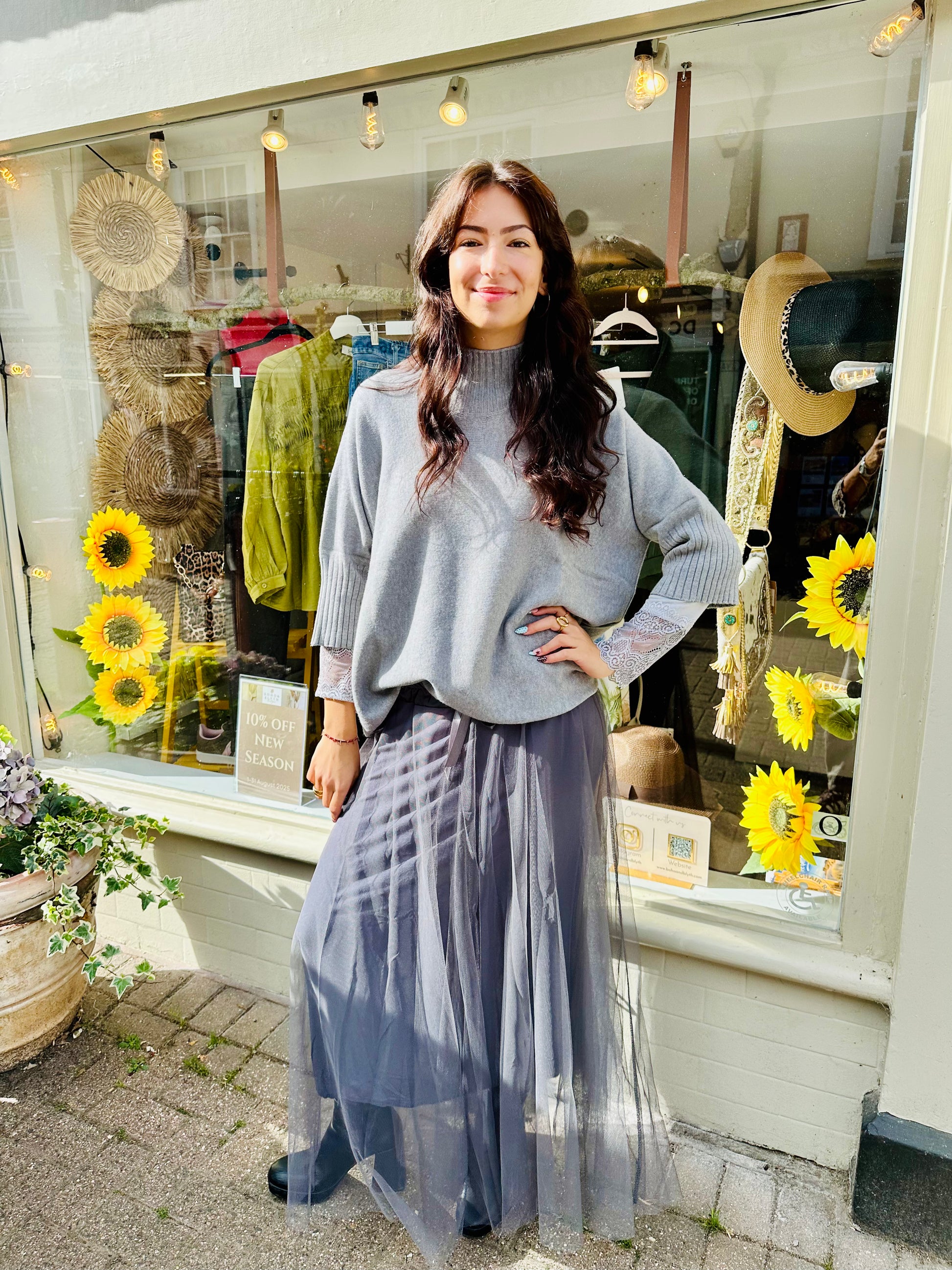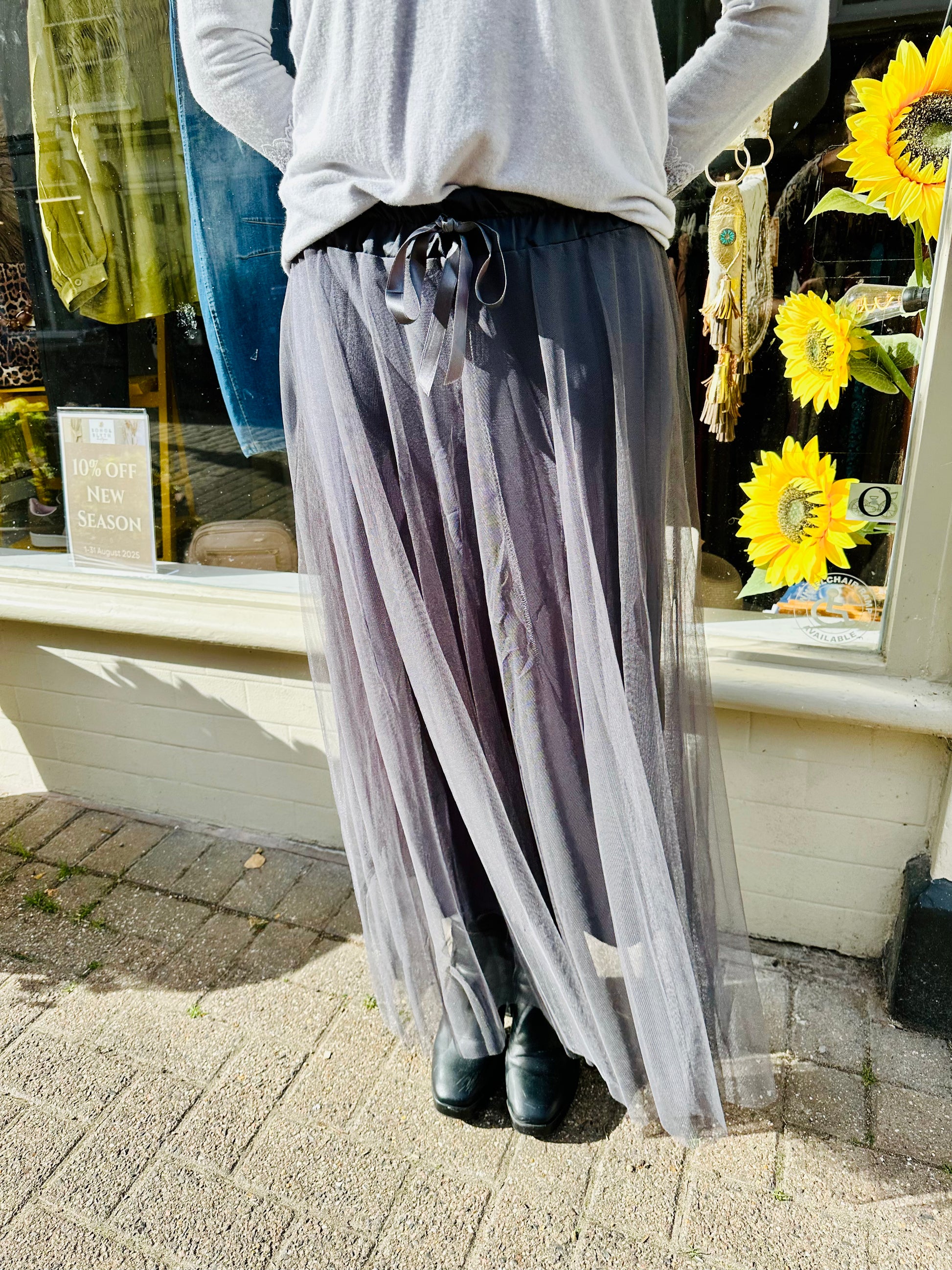 This stunning Mesh Tulle skirt will make a statement in this gorgeous Charcoal Grey shade. With a silky waist tie detailing the skirt is fully lined and looks great paired with boots or heels!