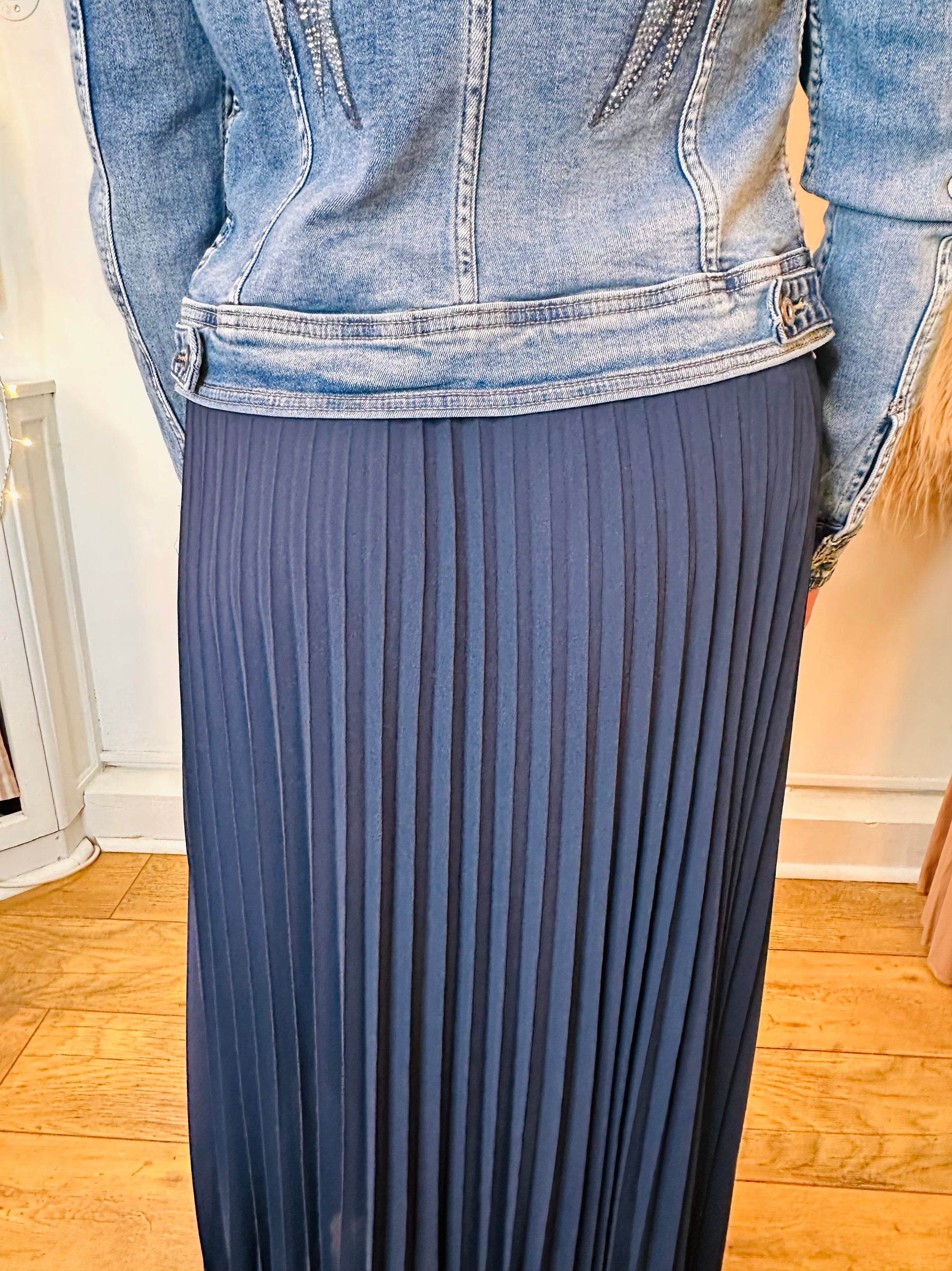 Navy pleated chiffon style midi skirt with elasticated waistband. Perfect for weddings, races, parties and day to evening occasions. Team with a blazer, soft knit or denim jacket. Available in other colours.