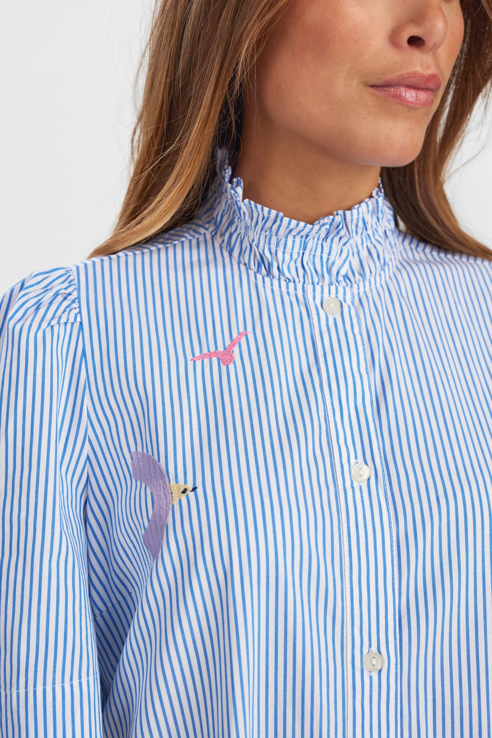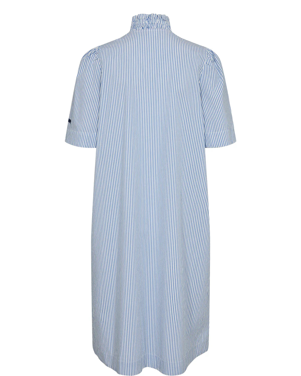 The Numph NuDebora Dress is relaxed, fun and comfortable to wear. Short, slightly puffed sleeves and pockets finish this blue and white striped dress with gorgeous embroidery.