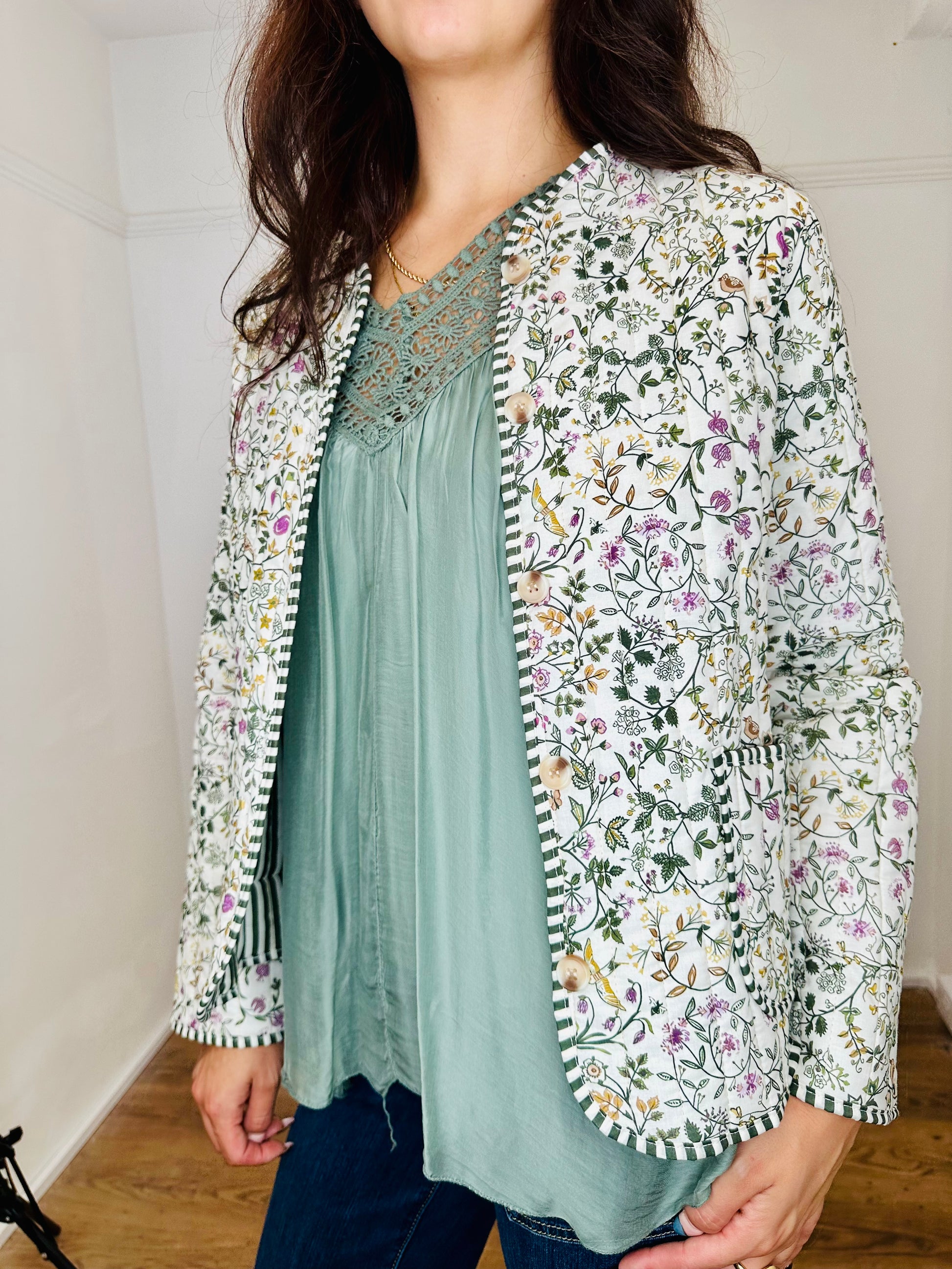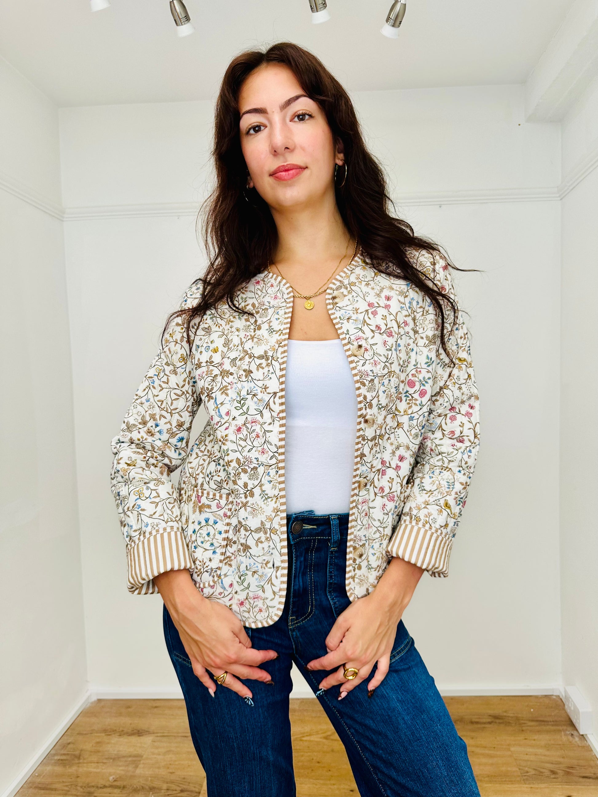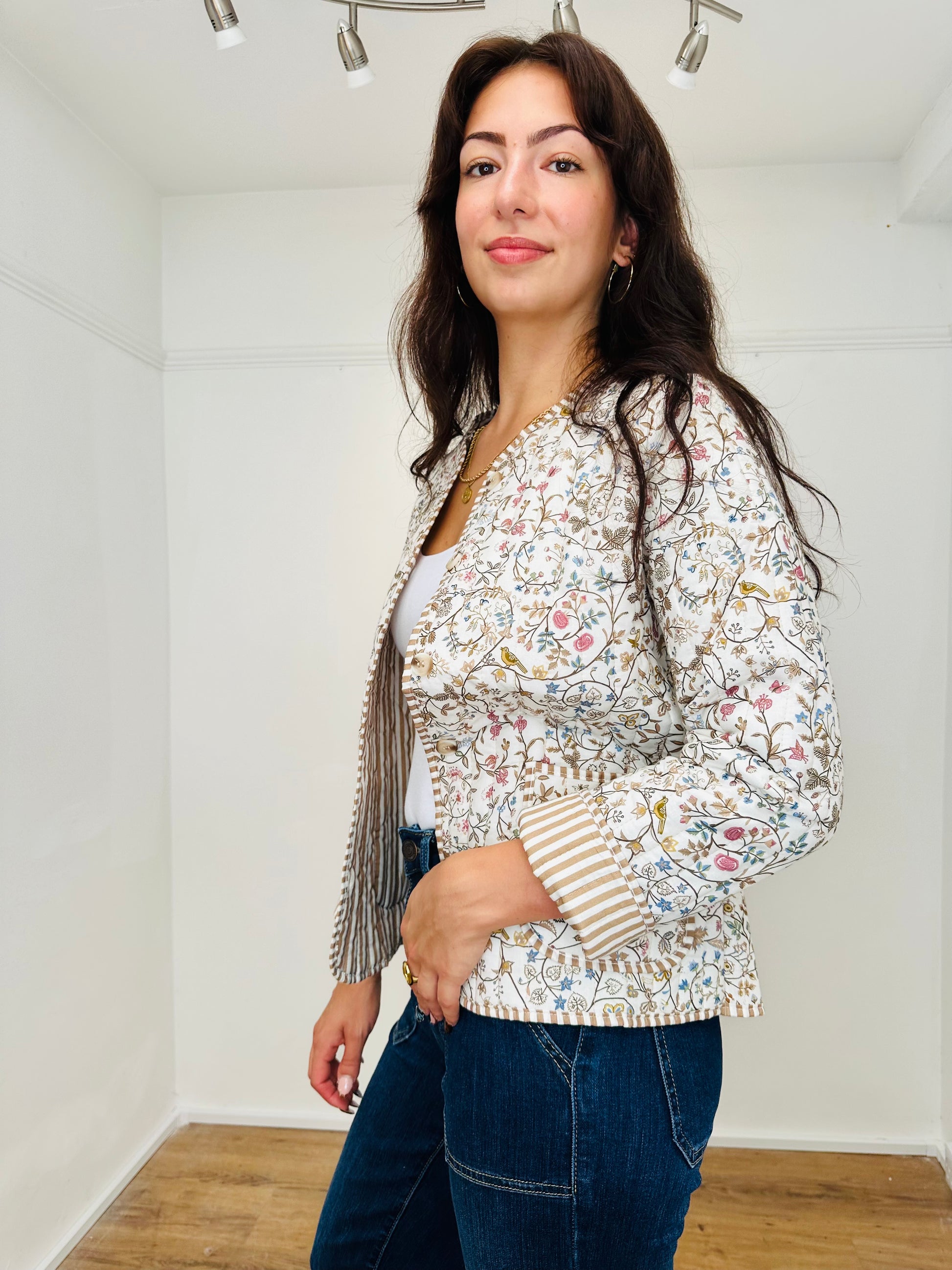 100% Cotton jacket with pretty all over ditsy floral print with contrasting striped lining.