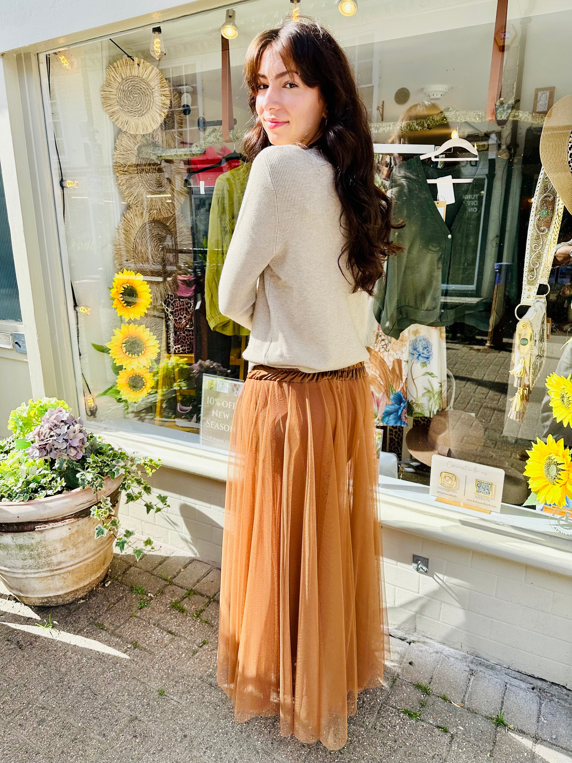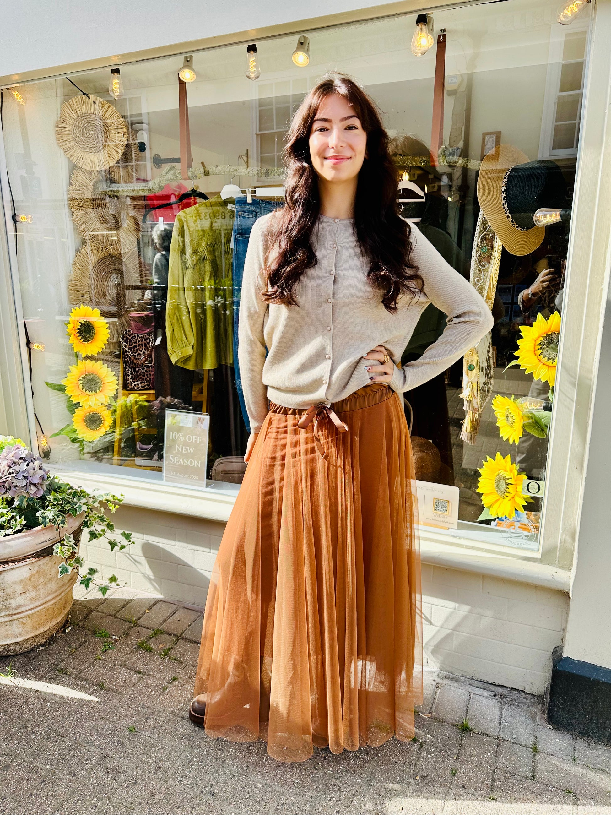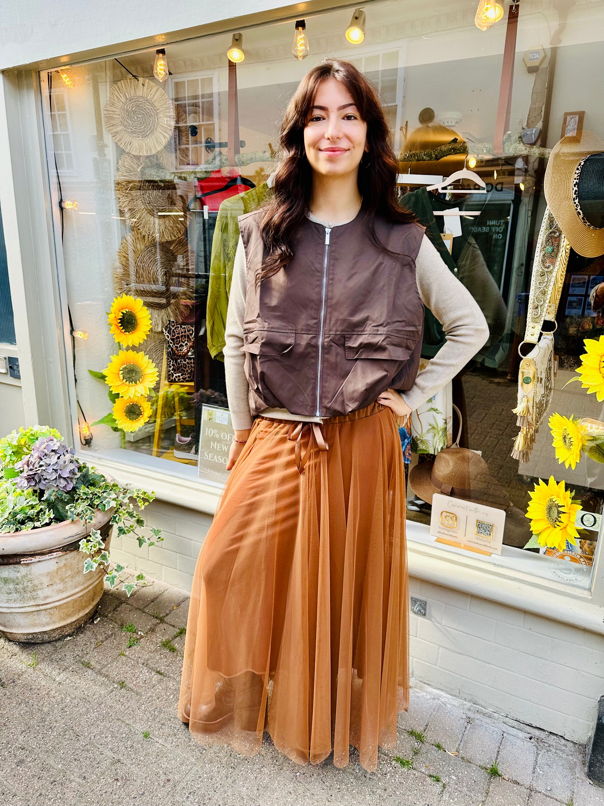 This stunning Mesh Tulle skirt will make a statement in this gorgeous Autumnal Brown shade. With a silky waist tie detailing the skirt is fully lined and looks great paired with boots or heels!