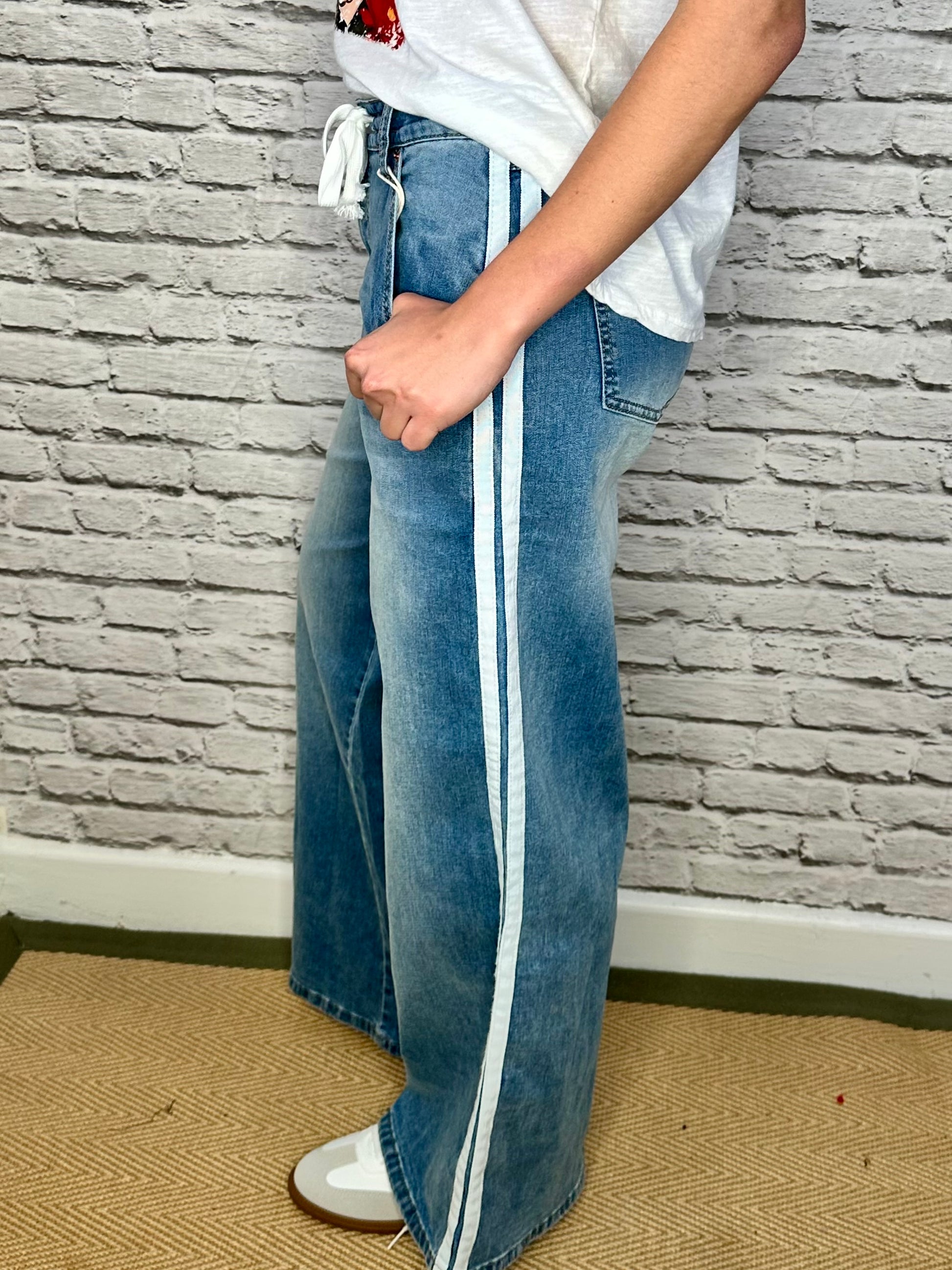 Rock this season's stripe in our super soft denim jeans with the comfort and on trend style of joggers. Pair with a white t-shirt and your favourite trainers for all day cool girl style.